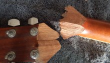 This guitar was brought to me with a broken headstock by the duo Black Lace. Here are some pictures of the various stages of repair.